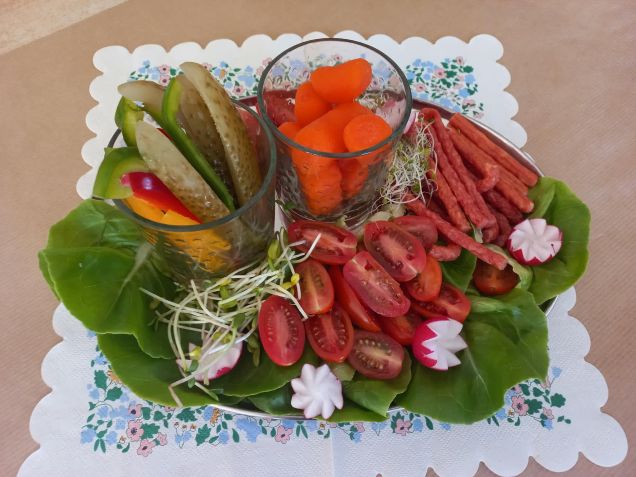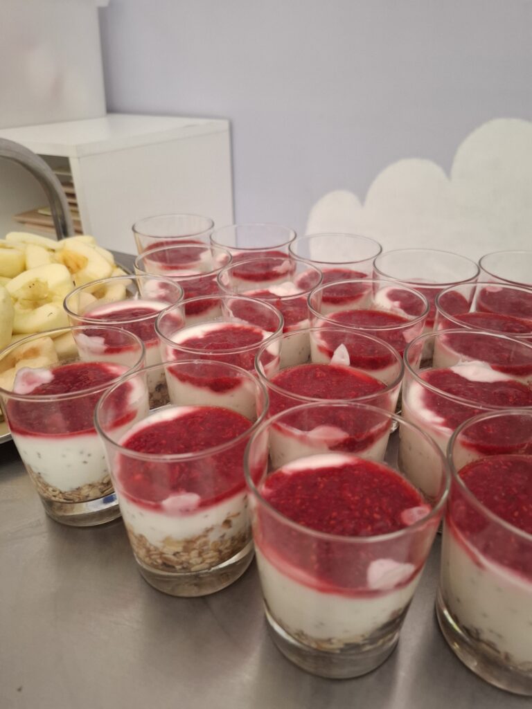 | Wtorek 24.03. Kanapki Zrób to sam! Pieczywo pszenno-żytnie, pieczywo razowe z ziarnami, masło, schab dziadkowy, serek śmietankowy, papryka żółta, roszponka, rzodkiewki, herbata czarna z cytryną, mleko | Deser pań kucharek Galaretka owocowa z bitą śmietaną, bananem oraz mandarynką, duża i zakręcona chrupka kukurydziana, herbata żurawinowa | Krem z pieczonej marchwi z pomarańczową nutą Sznycelki wieprzowe z ziemniakami puree, mizeria na jogurcie naturalnym, jabłko, kompot z wiśni |